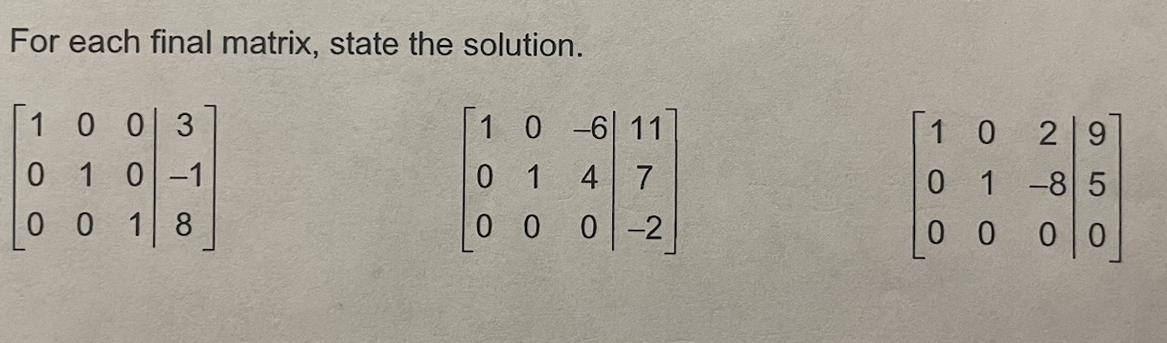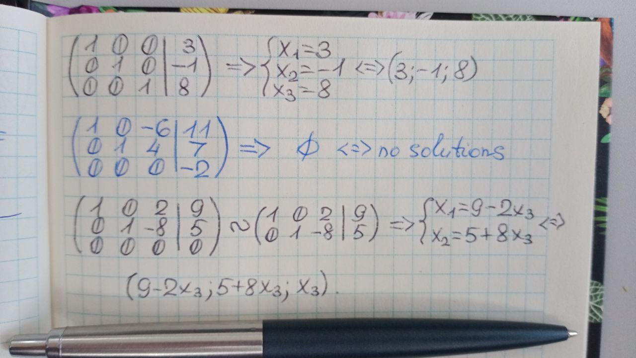 1) {3;-1;8}; 2) no roots; 3) {9-2x₃;5+8x₃;x₃}