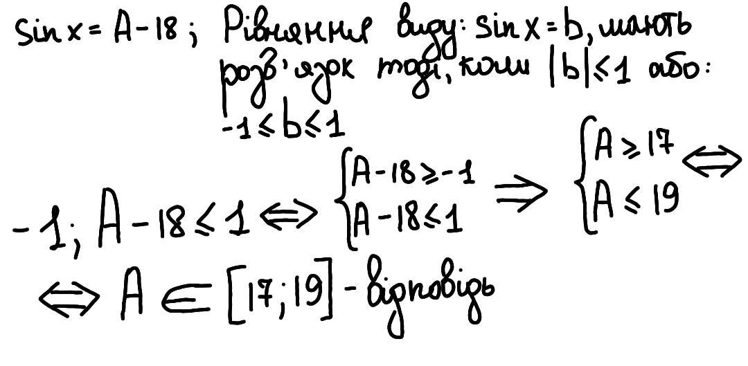 визнач усі значення параметра А, при яких рівняння sin x=a-18 має корені . выберу думку доя запису інтервалу .