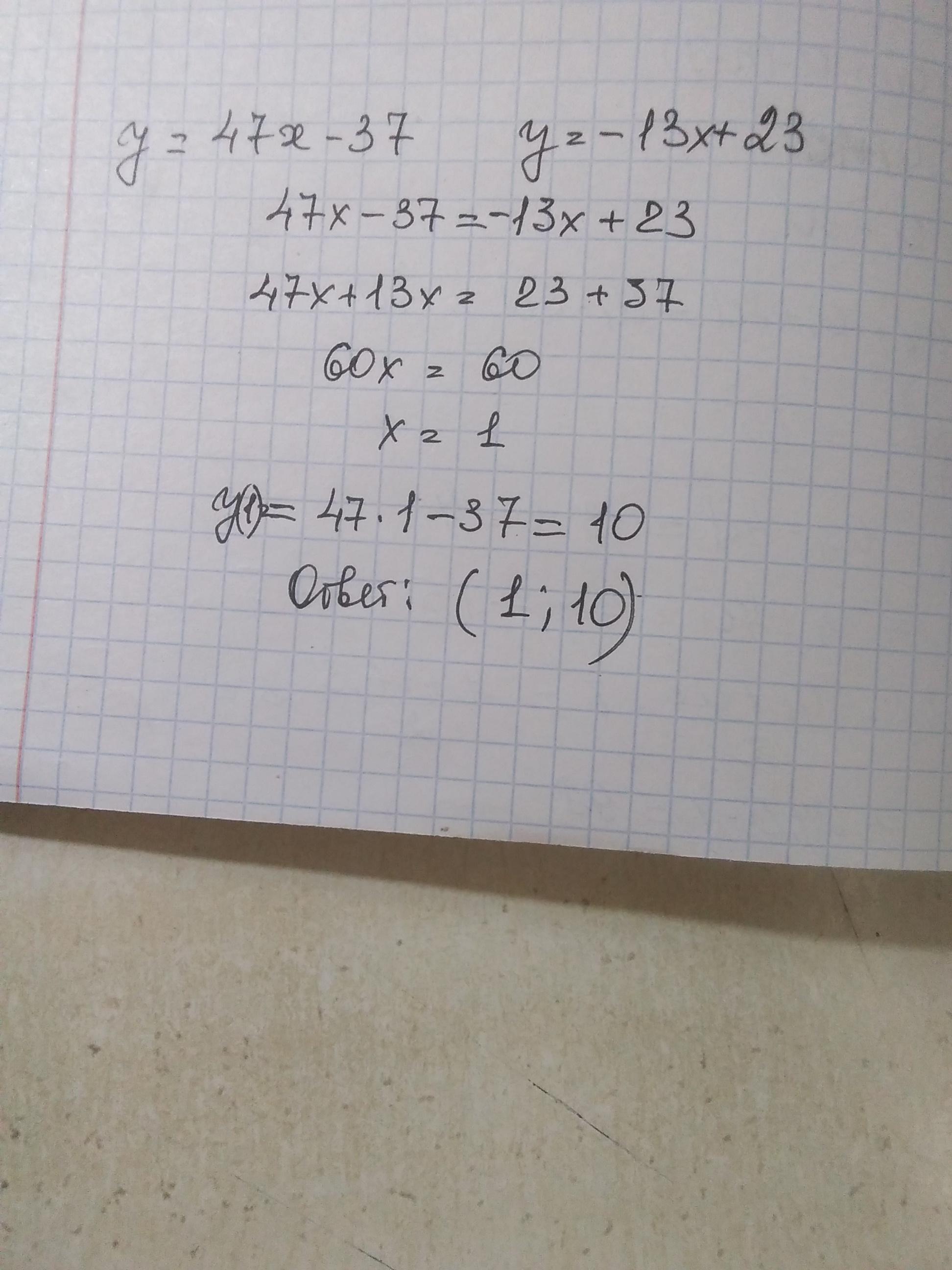 срочно пж даю 50 балов 7. Знайди координати точки перетину графiкiв функцiй у=47х-37 та у=-13x+23