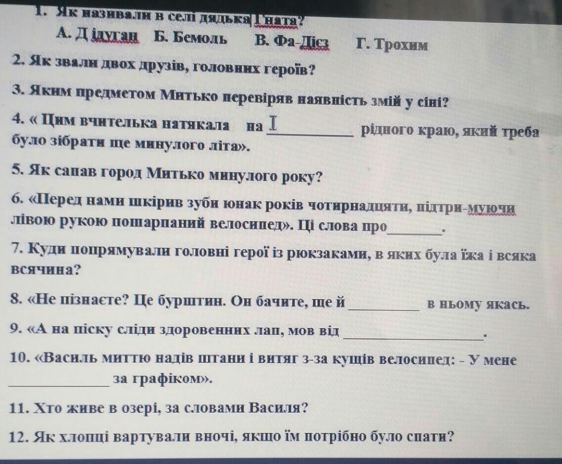 1)B. 2)Митько та Сергій. 3) Держаком сачка. 4) Цим вчителька натякала на гербарій рідного края, який треба було зібрати ще минулого літа. 5) Хлопців тут малувато, та й ті всі заклопотані – то город сапають, то по господарству… 6) Ці слова про Василя Троша. 7) Хлопці прямували в Юрківку. 8) Он бачите, ще й муха в ньому якась. 9) І на піску сліди здоровенних лап, мов од крокодила. 10) Василь миттю надів штани і витяг з-за кущів велосипед: - У мене гукнув знайомим насмішкуватим голосом. 11) таємниче і моторошне чудовисько. 12) Мені хотілося спати, хоча було страшнувато. Незчувся, як заснув. Розбудив насмішкуватий голос Митька, який прийшов змінити мене на варті. Мене мучили докори сумління, але коли згодом я вибрався з куреня, то побачив, що Митько теж солодко спить. Я обережно вкрив його ковдрою і теж пішов спати.