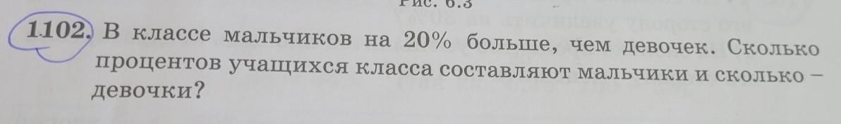 1102. В классе мальчиков на 20% больше, чем девочек. Сколько процентов учащихся класса составляют мальчики и сколько девочки?