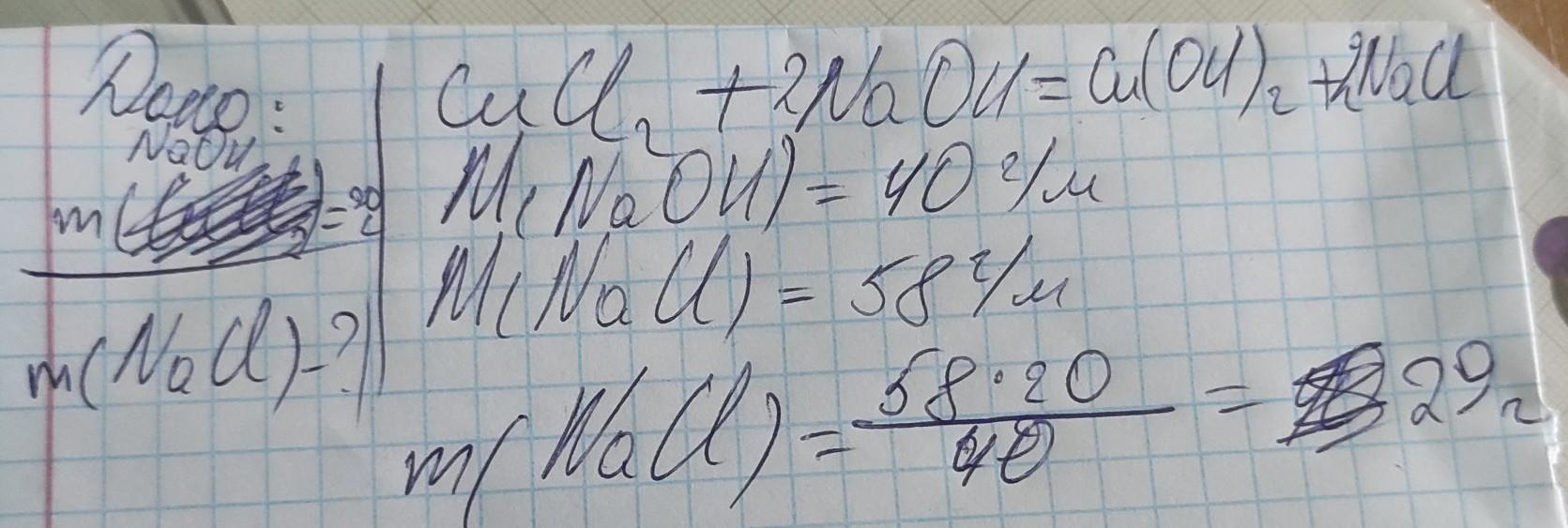 СРОЧНО!!!!!!!!!!!!!!!! Обчислити масу осаду. Що утвориться взаємодією купрум (ІІ) хлориду з натрій гідроксидом масою 20г.