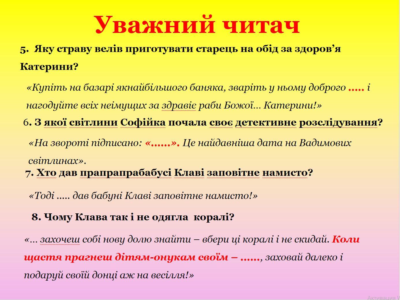5. Старець на обід звелів приготувати борщ. – Купіть на базарі якнайбільшого баняка, зваріть у ньому доброго борщу і нагодуйте всіх неімущих за здравіє раби Божої… Катерини!