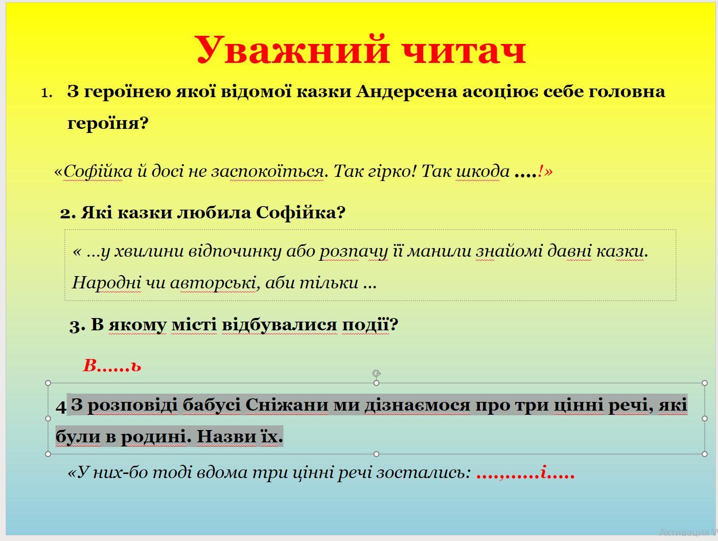 1. Софійка асоцією себе з Русалонькою із казки Андерсена. "Так шкода Русалоньки! "