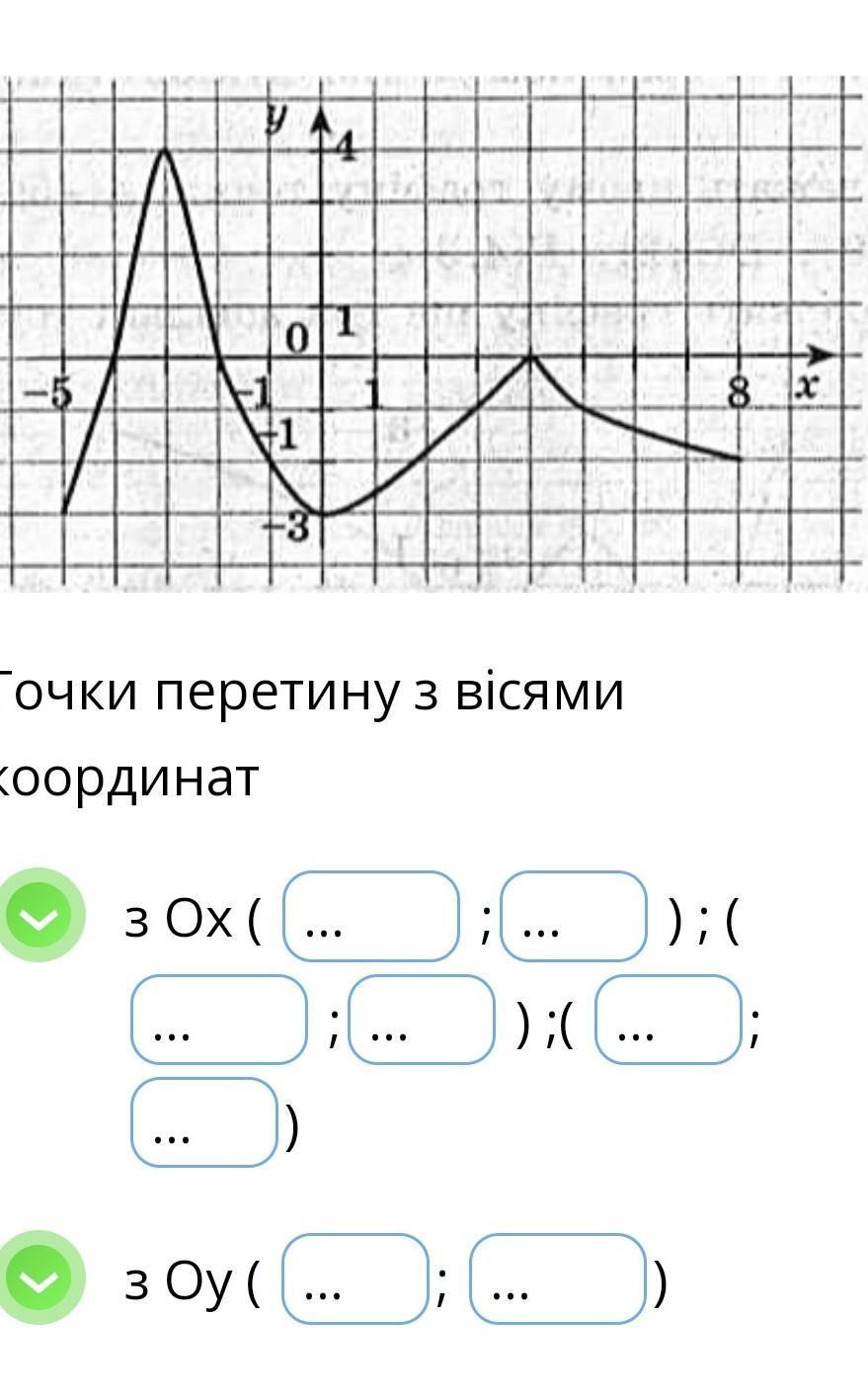 Точка перетину з віссю Оy має такі координати х і у, що x = 0, а y точка через яку графік перетинається з вертикальною віссю.