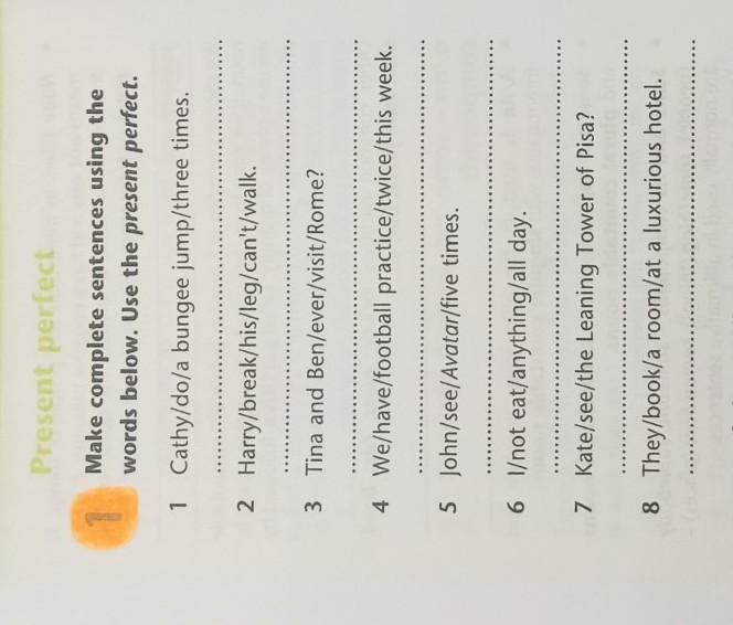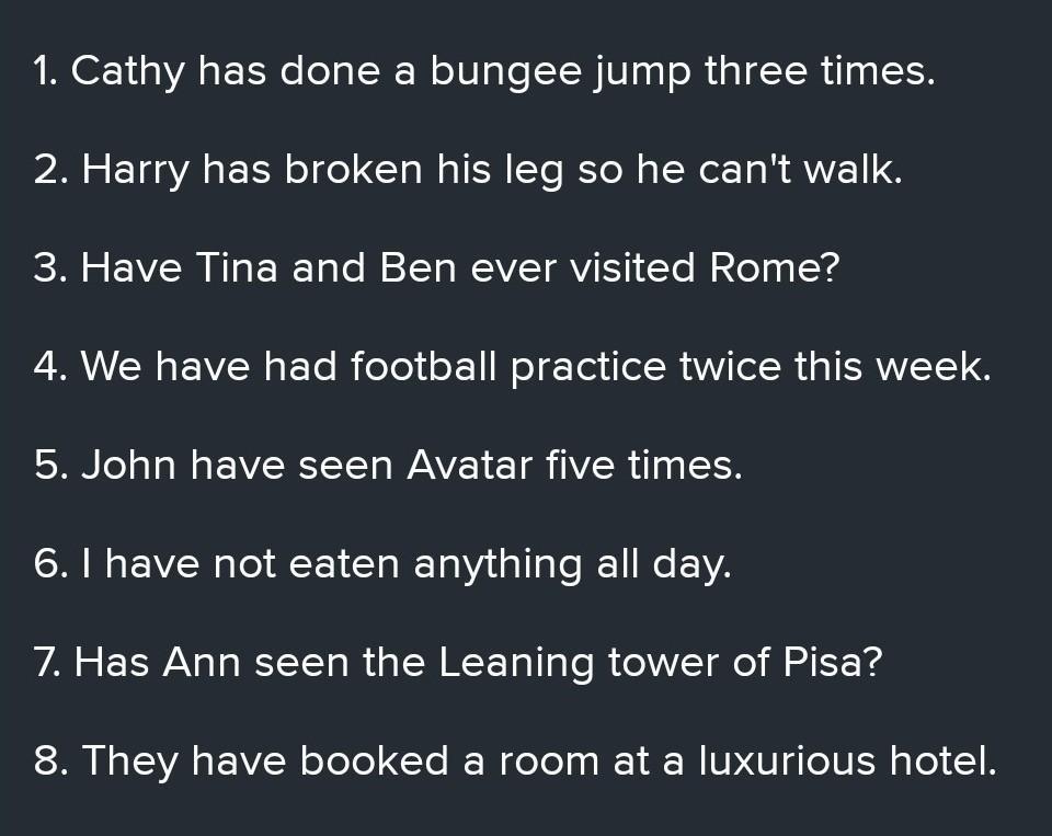 ДАЮ 30 БАЛОВ, ПОМОГИТЕ ПЖЖЖЖ!!!!!!!!!!!!Present perfect Make complete sentences using the words below. Use the present perfect. 1 Cathy/do/a bungee jump/three times. 2 Harry/break/his/leg/can't/walk. 3 Tina and Ben/ever/visit/Rome? 4 We/have/football practice/twice/this week. 5 John/see/Avatar/five times. 6 1/not eat/anything/all day. 7 Kate/see/the Leaning Tower of Pisa? 8 They/book/a room/at a luxurious hotel. juba 3