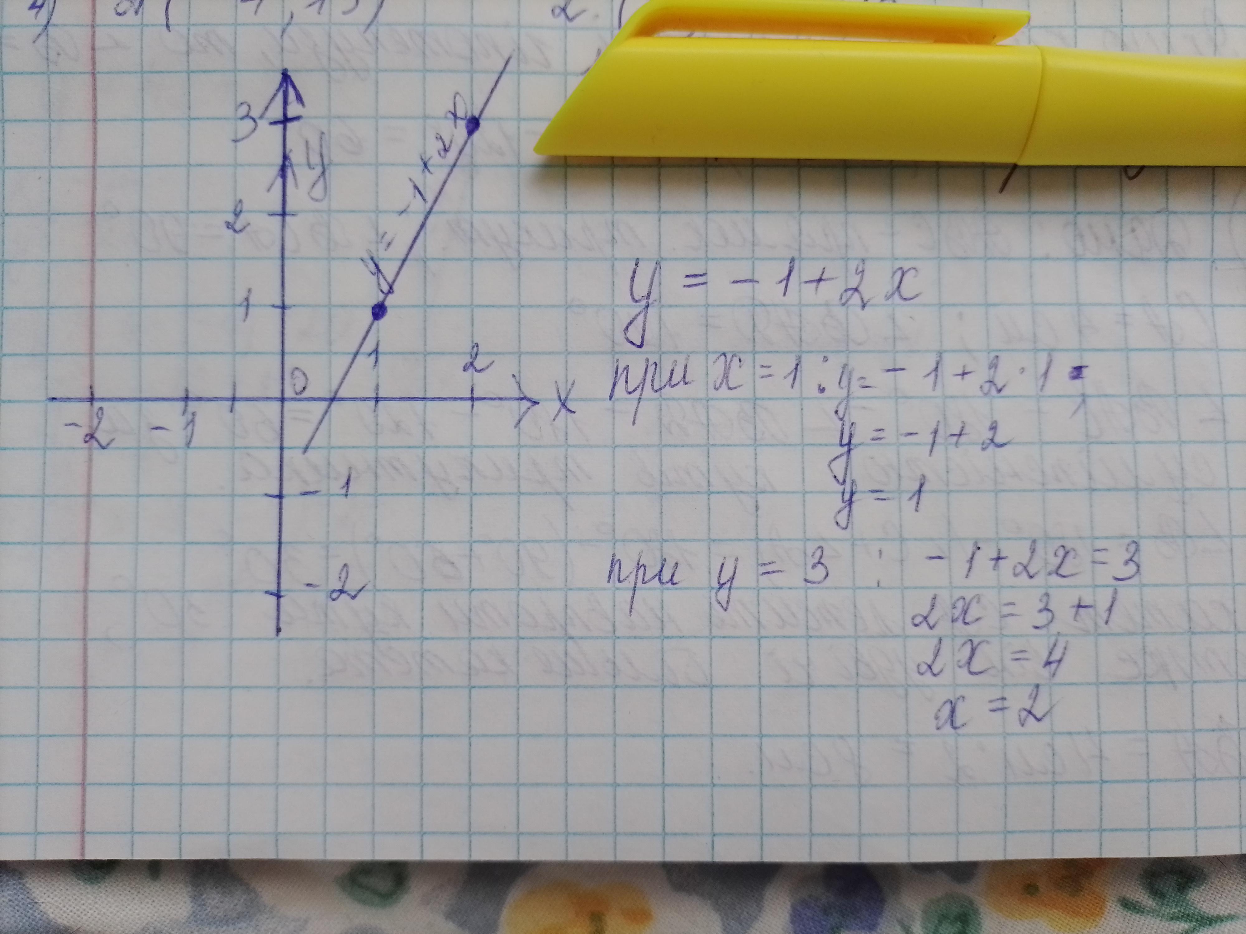 Побудуйте графік функцій y=-1+2x.Користуючись графіком :Знайдфть а)значення функцій при x=1; б)значення аргументу ,при якому y=3.