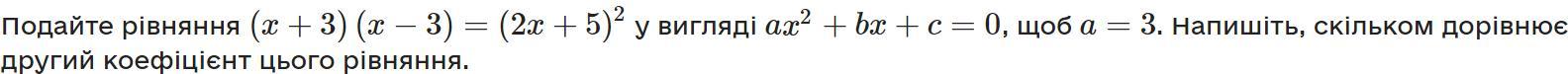 Подайте рівняння (x+3)(x−3)=(2x+5)^2 у вигляді ax^2+bx+c=0 , щоб a=3 . Напишіть, скільком дорівнює другий коефіцієнт цього рівняння.