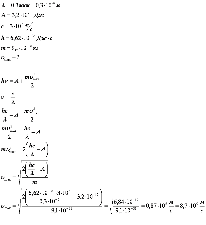 какую максимальную скорость могут получить вырванные из калия электроны при облучении его светом с длиной волны 0,3 мкм работа выхода для калия равна 3,2*10 в -19 степени плиизззз