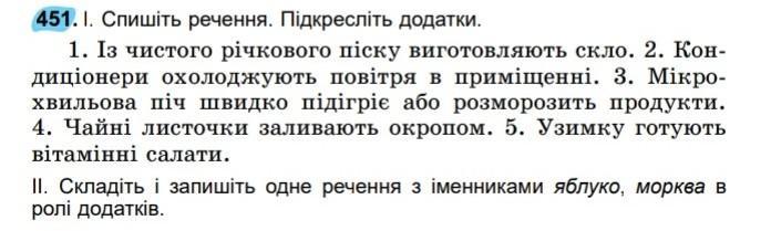 Із чистого річкового піску виготовляють скло ( піску-додаток). Кондиціонери охолоджують повітря в приміщенні ( повітря-додаток ). Мікрохвильова піч швидко підігріє або розморозити продукти ( продукти - додаток ). Чайні листочки заливають окропом (окропом - додаток). Узимку готують вітамінні салати ( узимку - додаток ).