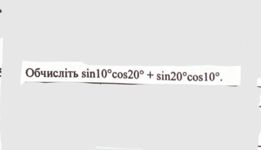 Это формула суммы синусов (sin(a+b)=sina*cosb+sinb*cosa) Значит тут будет: sin(10+20)=sin30=1/2
