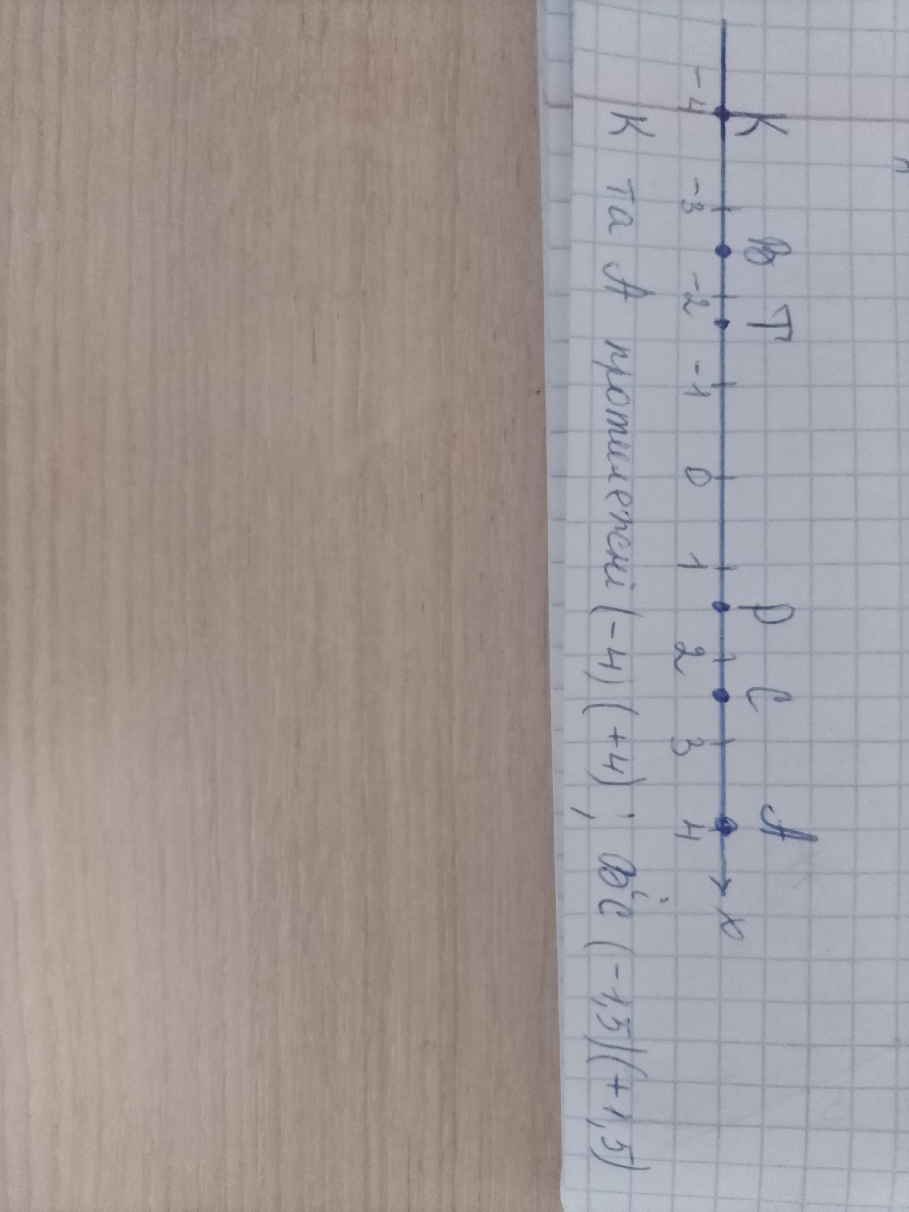 Позначте на координатній прямій точки А(4) В(-2,5) С(2,5) К(-4) P(1,5) T(-0,75) які з позначених точок мають протилежні координати? Запишіть координати цих точок (желательно намялювати цю пряму на зошиті любому все зробити і відіслати зразу скажу дякую)