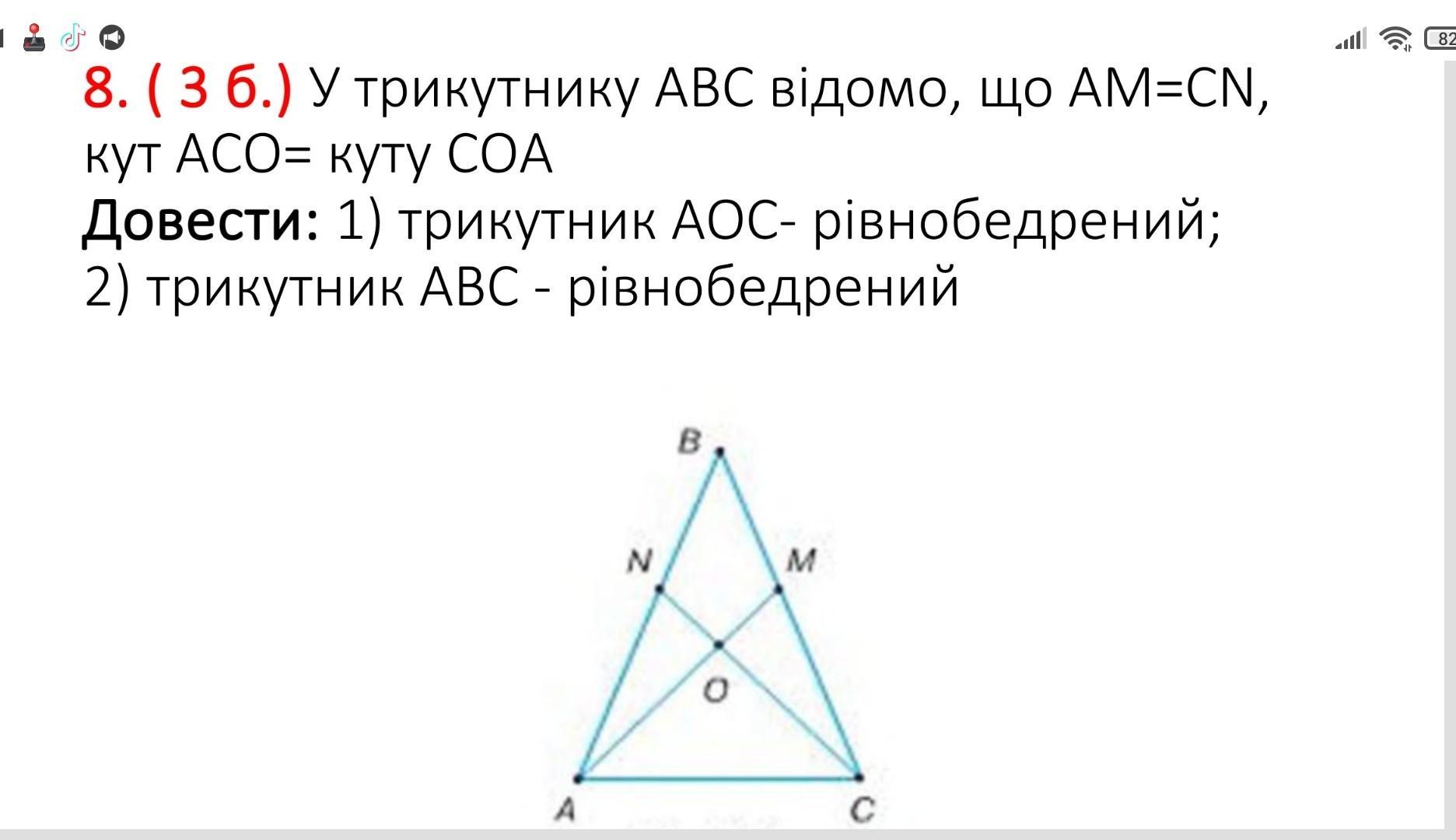 1) ΔАОС - рівнобедрений, тому що кути при основі рівнобедреного трикутника рівні (за умовою)