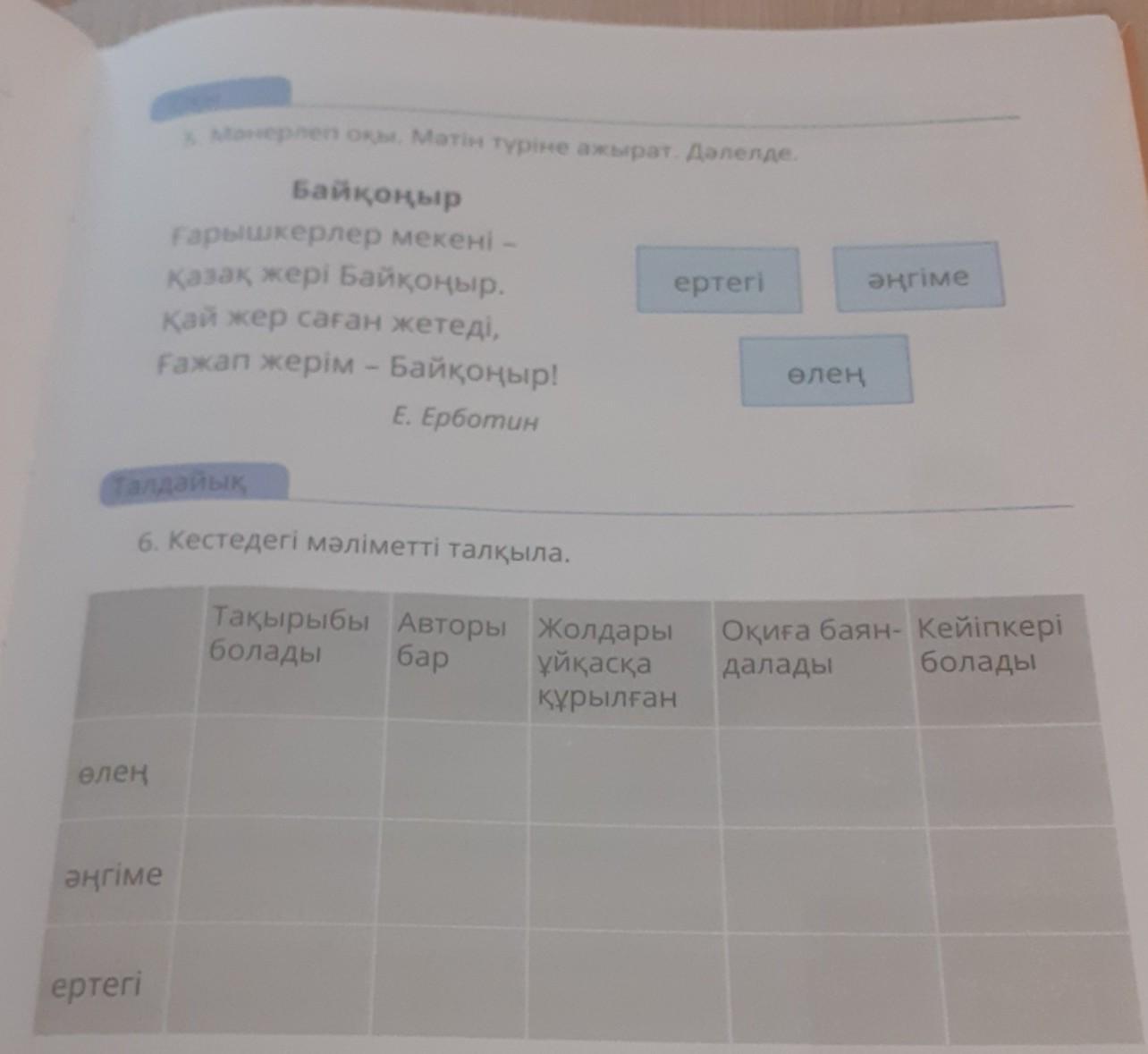 талдайық 6. Кестедегі мәліметті талқыла. өлең әңгіме ертегі Тақырыбы болады Авторы бар Жолдары ұйқасқа құрылған Оқиға баян- Кейіпкері болады далады