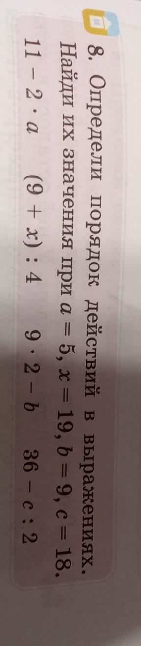 - 8. Определи порядок действий в выражениях. Найди их значения при а = 5, x = 19, b = 9, c = 18. 9.2-b 36 -с: 2 (9 + x): 4 11 - 2 . a