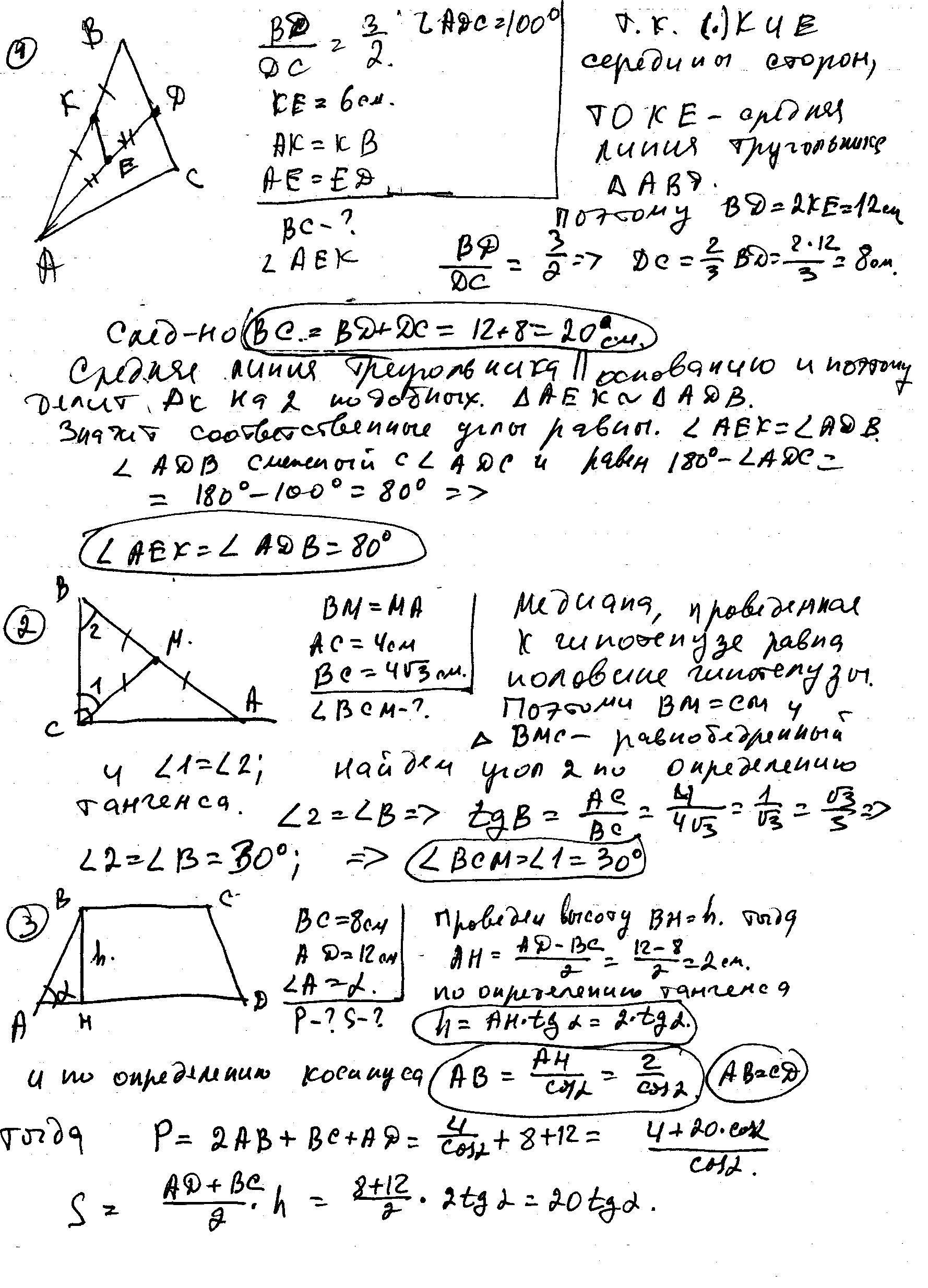1.На стороне ВС треугольника АВС выбрана точка D так,что ВD:DC=3:2,точка К-середина отрезка АВ,точка E-середина отрезка АD,КЕ=6см,<ADC=100грудусов.Найдите длину стороны ВС и величину угла АЕК