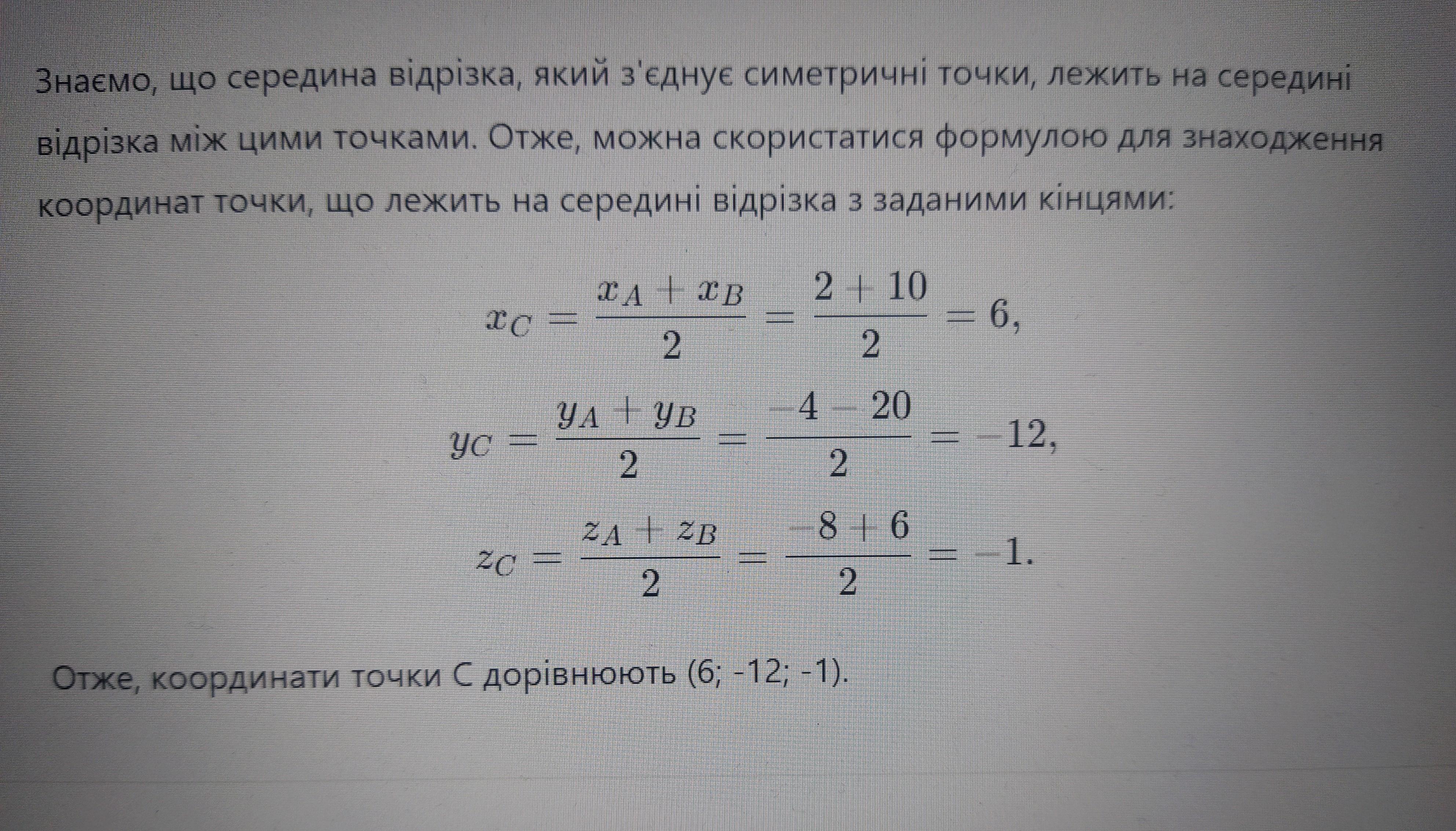 Точки А( 2; -4; -8) і В(10; -20; 6) симетричні відносно точки С.