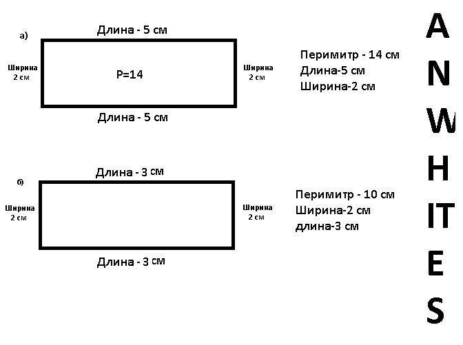б) периметр 10 см, а ширина 2 см, длина 3 см