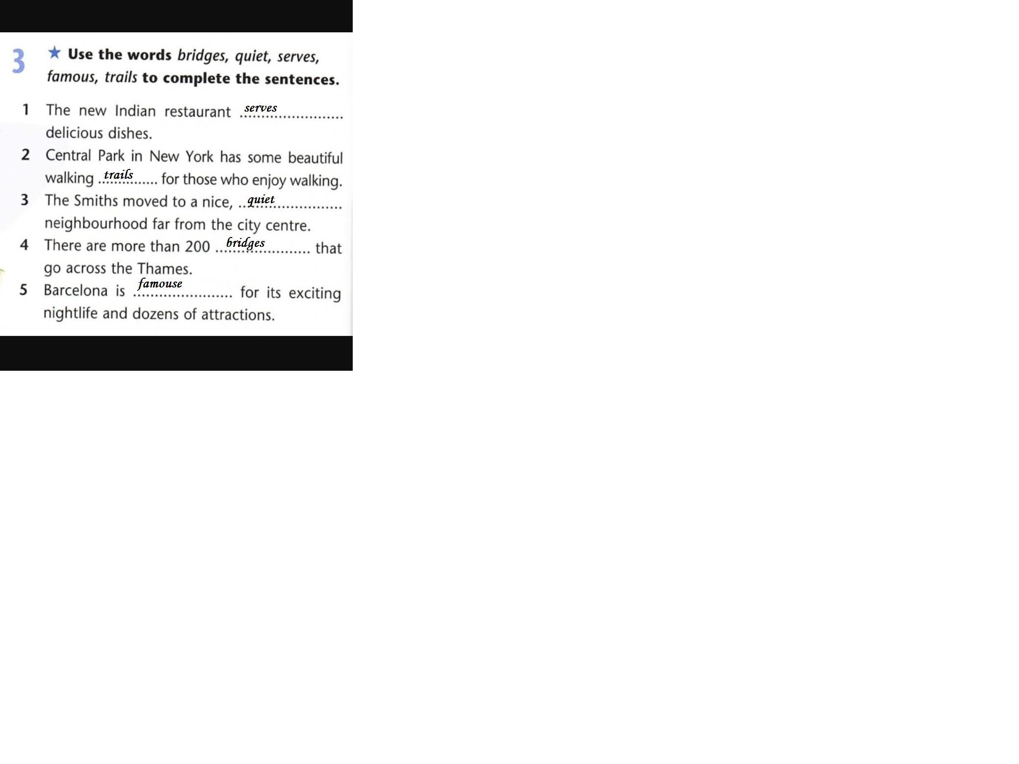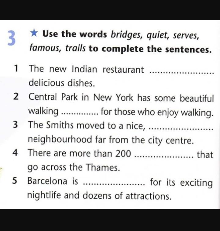 3 ★ Use the words bridges, quiet, serves, famous, trails to complete the sentences. 1 The new Indian restaurant delicious dishes. 2 Central Park in New York has some beautiful walking ............... for those who enjoy walking. 3 The Smiths moved to a nice, ...... neighbourhood far from the city centre. 4 There are more than 200 go across the Thames. 5 Barcelona is ...... ..... for its exciting .................. ..... that nightlife and dozens of attractions.