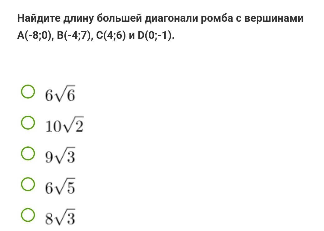 Срочно!!!Найдите длину большей диагонали ромба с вершинами A(-8;0), B(-4;7), C(4;6) и D(0;-1).