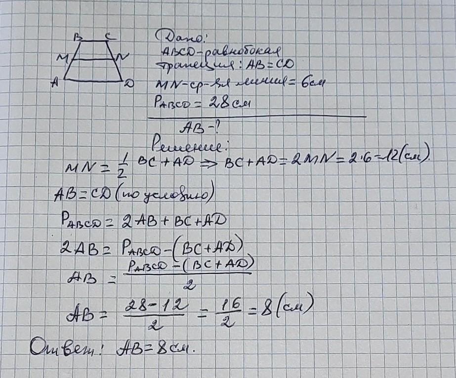 АВ=DC = (28-12)/2= 16/2= 8 cm