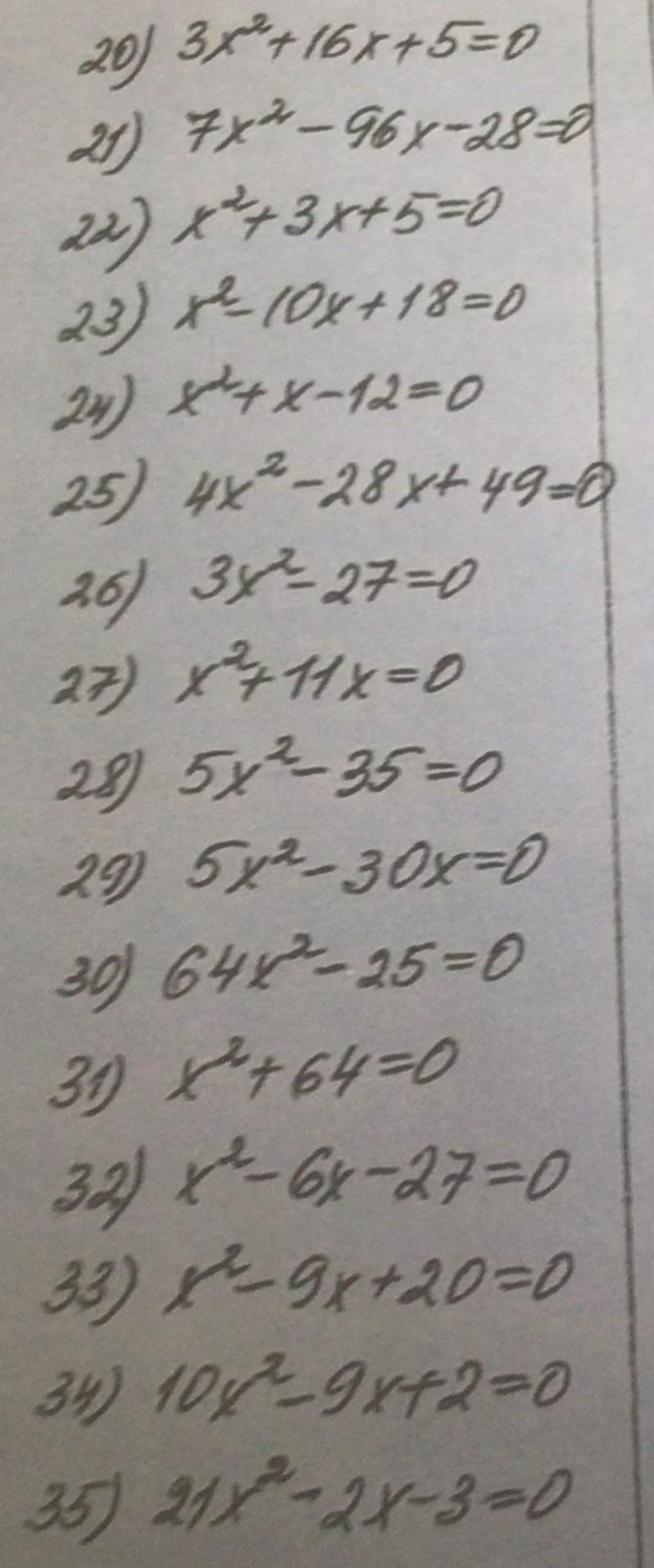 27) x²+ 11x = 0 ; 28) 5x²- 35 = 0 ; 29) 5x²- 30x = 0 ; 30) 64x²- 25 = 0 ;