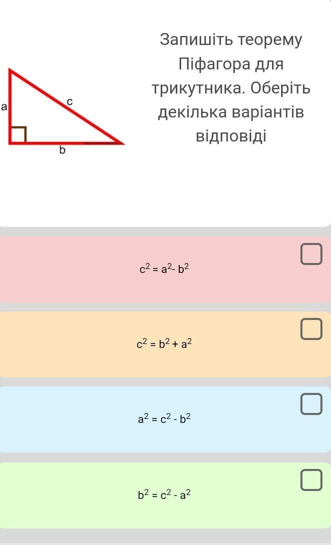 a b C Запишіть теорему Піфагора для трикутника. Оберіть декілька варіантів відповіді c2 = а2- b2 c2 = b2 + а2 a2 = c2 - b2 b2 = c2 - a²