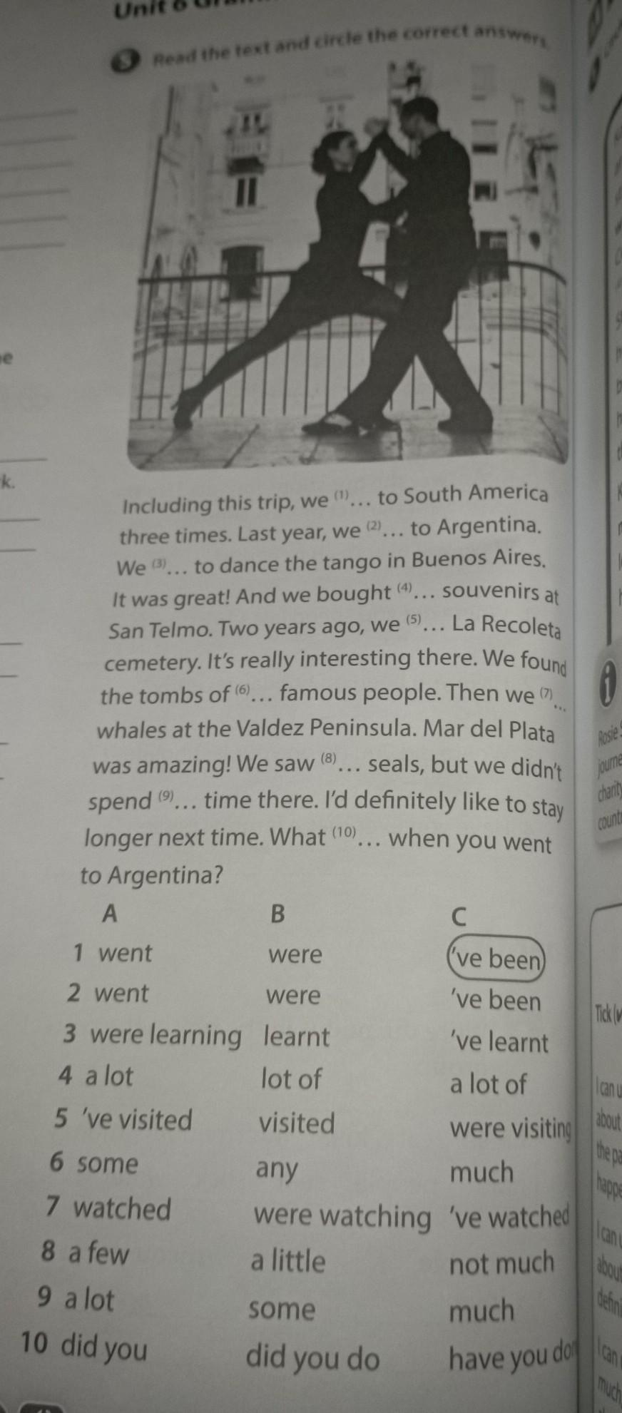 Including this trip, we have been to South America three times. Last year, we went to Argentina. We went to dance the tango in Buenos Aires. It was great! And we bought a lot of souvenirs at San Telmo. Two years ago, we visited La Recoleta cemetery. It's really interesting there. We found the tombs of many famous people. Then we watched whales at the Valdez Peninsula. Mar del Plata was amazing! We saw some seals, but we didn't spend much time there. I'd definitely like to stay longer next time. What did you do when you went to Argentina?