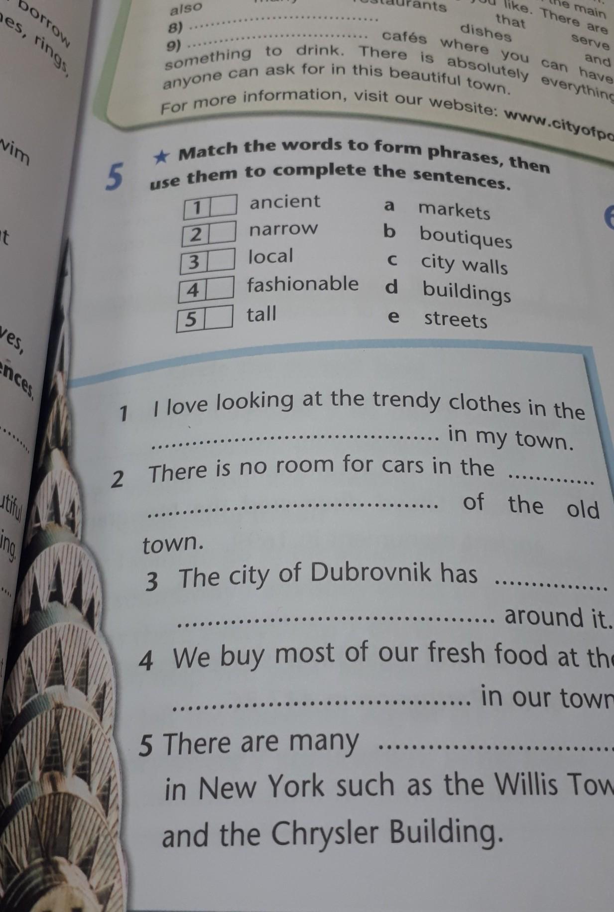 5 For more inf Match the words to form phrases, then use them to complete the sentences. 2 3 4 5 ancient narrow local a b с fashionable d e tall markets boutiques city walls buildings streets www.cityofpostvil I love looking at the trendy clothes in the 1 in my town. 2 There is no room for cars in the ....... ******** .. of the old town. 3 The city of Dubrovnik has .... around it. 4 We buy most of our fresh food at the ....... in our town. 5 There are many in New York such as the Willis Tower and the Chrysler Building. 6 2 3 C 4