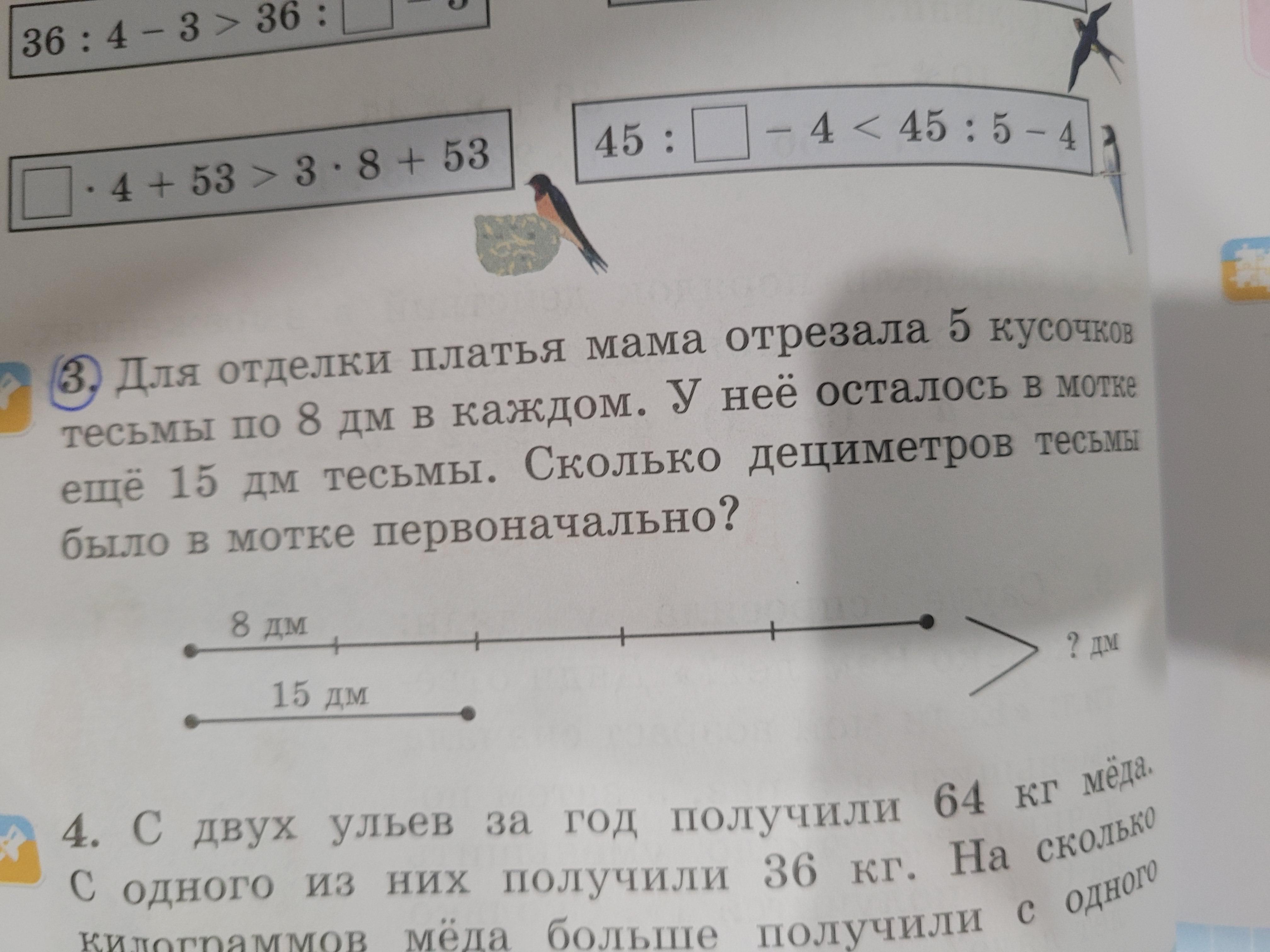 Помогите пожалуйста решить задачу! Для отделки платья мама отрезала 5 кусочков тесьмы по 8 дм в каждом У неё осталось в мотке ещё 15 дм тесьмы. Сколько дециметров тесьмы тесьмы было в мотке первоначально?