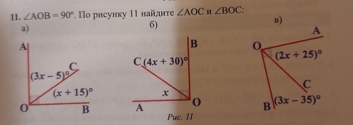 11. ZAOB = 90º. По рисунку 11 найдите ZАОС и ZВОС: a) 6) Al (3x-5)9 (x + 15)° В C (4x + 30) А X В 0 Puc. 11 ALON А (2x+25)° в (3x-35)°