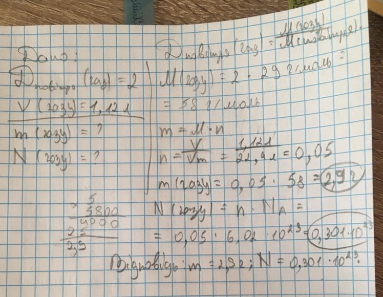 Відносна густина газу за повітрям дорівнює 2. Обчислити масу зразка цього газу об'ємом 1,12 л та число молекул у ньому.