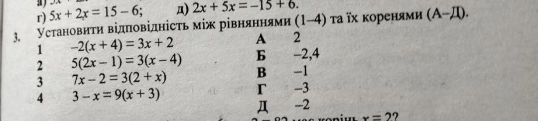 Установити відповідність між рівняннями (1-4)та їх коренями (А-Д)