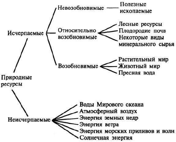 - исчерпаемые, возобновляемые- почвы, водоёмы, воздух, растительный мир,