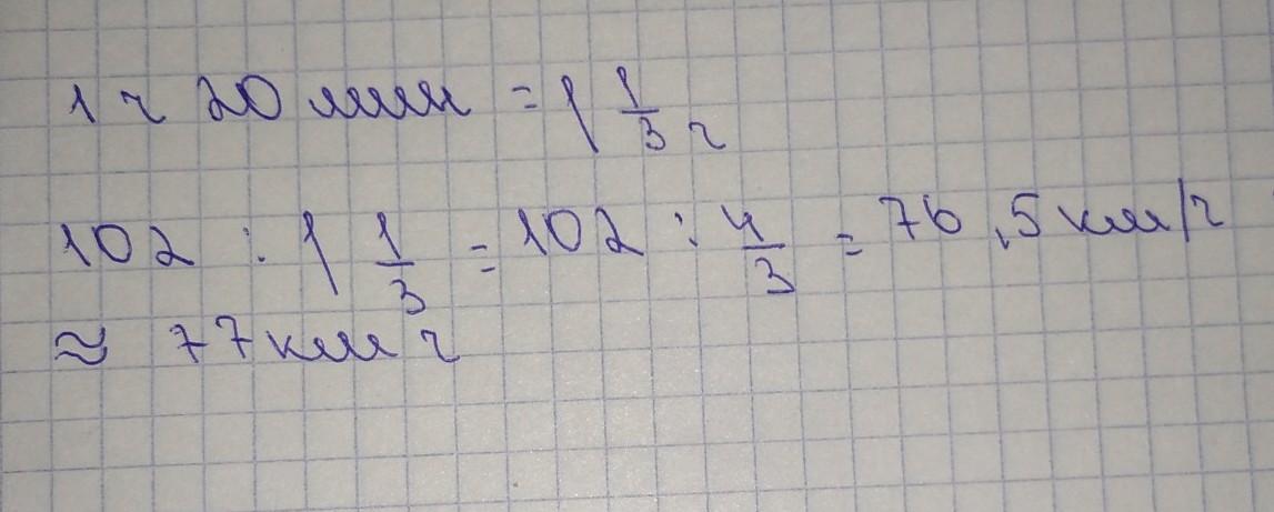 Автобус за 1 час 20 минут проехал 102км расстояния. Чему приблизительно равна средняя скорость автобуса