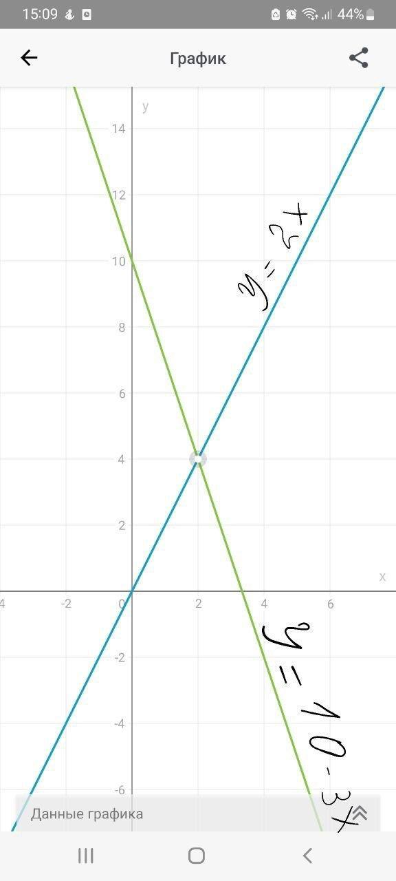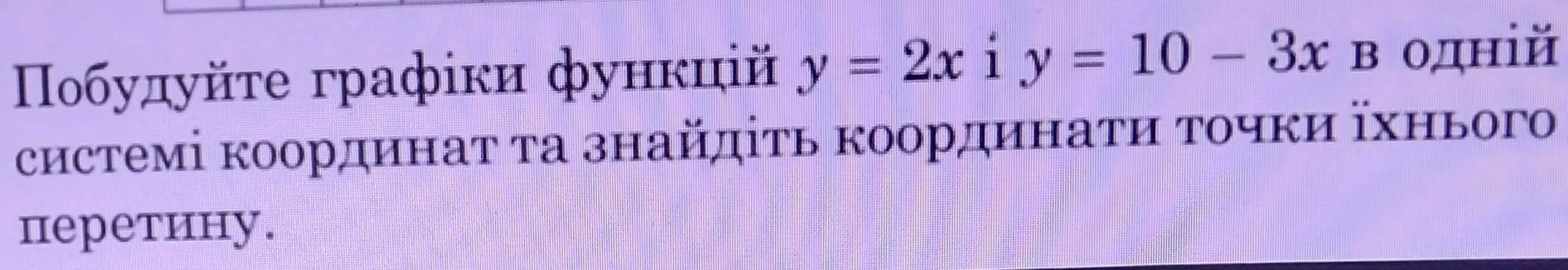 Побудуйте графіки функцій у = 2x i y = 10 - 3х в одній системі координат та знайдіть координати точки їхнього перетину.