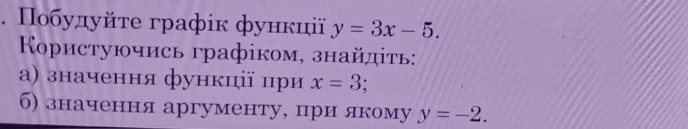 Побудуйте графік функції у = 3x - 5. Користуючись графіком, знайдіть: а) значення функції при x=3; б) значення аргументу, при якому у = -2.
