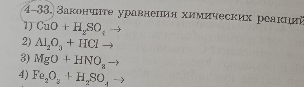 Свойства оксидов и их применение 4-33. Закончите уравнения химических реакций: 1) CuO + H2SO4 → 2) Al2O3 + HCl → 3) MgO + HNO3 → 4) Fe2O3 + H2SO →