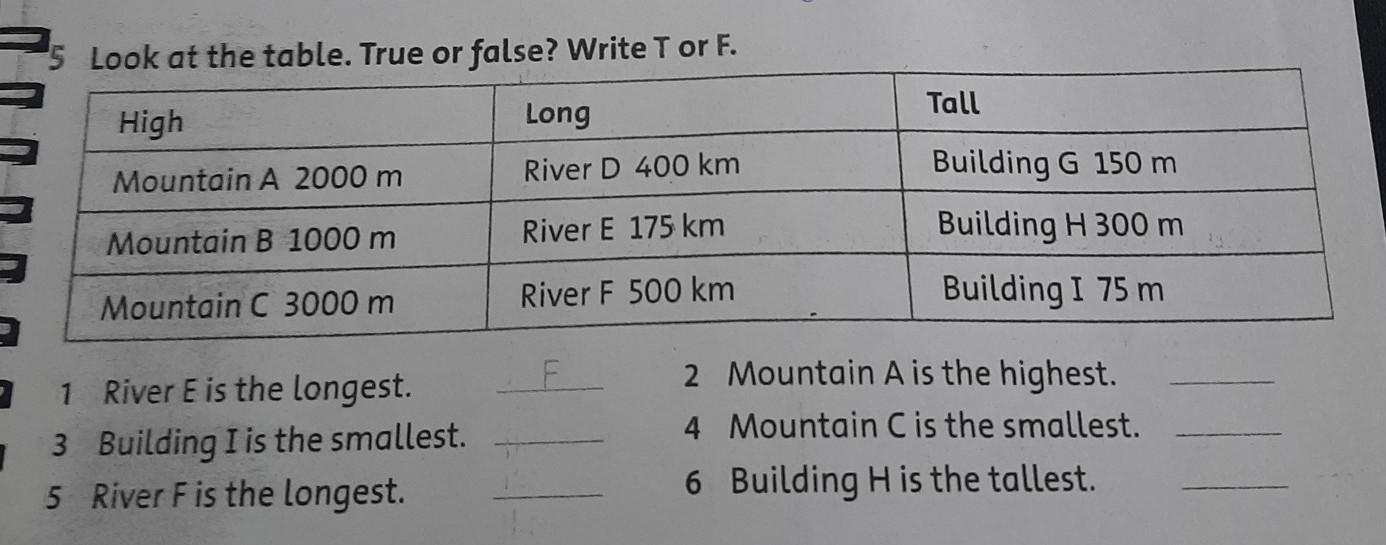 5 Look at the table. True or false? Write T or F. High Mountain A 2000 m Mountain B 1000 m Mountain C 3000 m 1 3 5 River F is the longest. River E is the longest. Building I is the smallest. Long River D 400 km River E 175 km River F 500 km 41 2 4 6 Tall Building G 150 m Building H 300 m Building I 75 m Mountain A is the highest. Mountain C is the smallest. Building H is the tallest.