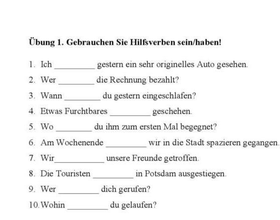Übung 1. Gebrauchen Sie Hilfsverben sein/haben! 1. Ich 2. Wer 3. Wann 4. Etwas Furchtbares 5. Wo 6. Am Wochenende 7. Wir 8. Die Touristen 9. Wer 10. Wohin gestern ein sehr originelles Auto gesehen. die Rechnung bezahlt? du gestern eingeschlafen? geschehen. du ihm zum ersten Mal begegnet? wir in die Stadt spazieren gegangen. unsere Freunde getroffen. in Potsdam ausgestiegen. dich gerufen? du gelaufen?
