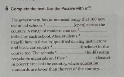 The government has announced today that 100 new technical schools will be opened across the country. A range of modern courses will be offered by each school. Also, students will be taught how to drive by qualified driving instructors and basic car repairs will be included in the course too. The schools will be built using recyclable materials and they will be located in poorer areas of the country, where education standards are lower than the rest of the country.