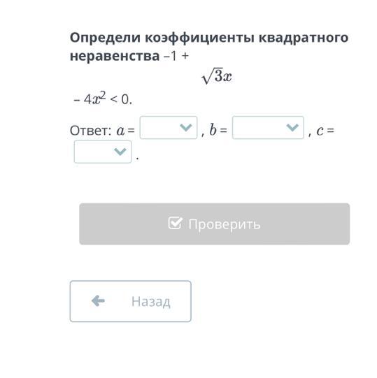 - 4 {x}^{2}  +  \sqrt{3} x - 1 < 0 \\ a =  - 4  \\  b =  \sqrt{3}  \\ c =  - 1