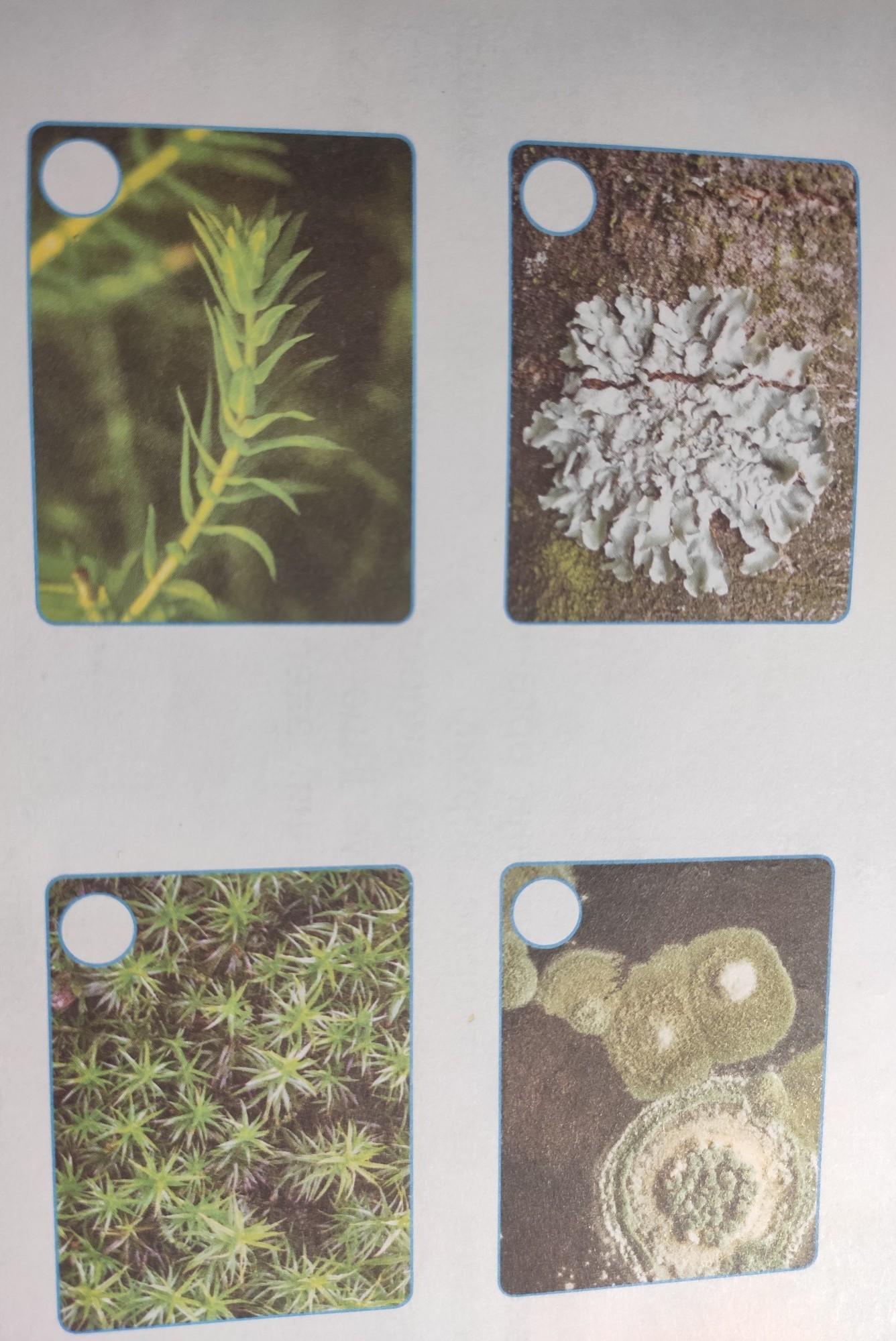 5 Розглянь світлини. Зафарбуй кружечок біля організму, який виник у наслідок співіснування грибів і водоростей.