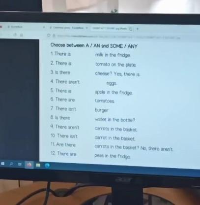 08 Choose between A/AN and SOME / ANY 1 There is milk in the fridge 2. There is tomato on the plate 3 is there cheese? Yes, there is 4 There aren't 5. There is 6. There are 7 There isn't 8 is there q There aren't 10 There isn't 11 Are there 12. There are eggs apple in the fridge tomatoes burger water in the bottle? carrots in the basket carrot in the basket carrots in the basket? No, there aren't peas in the fridge