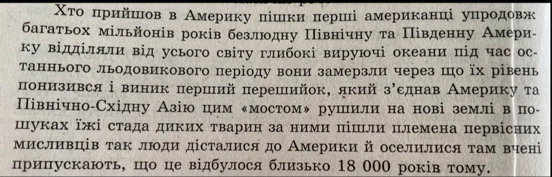 Хто прийшов в Америку пішки? Перші американці. Упродовж багатьох мільйонів років безлюдну Північну та Південну Америку відділяли від усього світу глиббокі вируючі океани. Під час останнього льодовикового періоду вони замерзли через що їх рівень понизився і виник перший перешийок, який з'єднав Америку та Північно-Східну Азію. Цим "мостом" рушили на нові землі в пошуках їжі стада диких тварин. За ними пішли племена первісних мисливців. Так люди дісталися до Америки й оселилися там. Вчені припускають, що це відбулося близько 18 000 років тому.