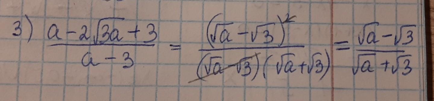 a - 2√3a + 3/ a-3 = (√a - √3)²/ (√a - √3) (√a + √3) (Сокращаем выделенное) = √а - √3/√а + √3