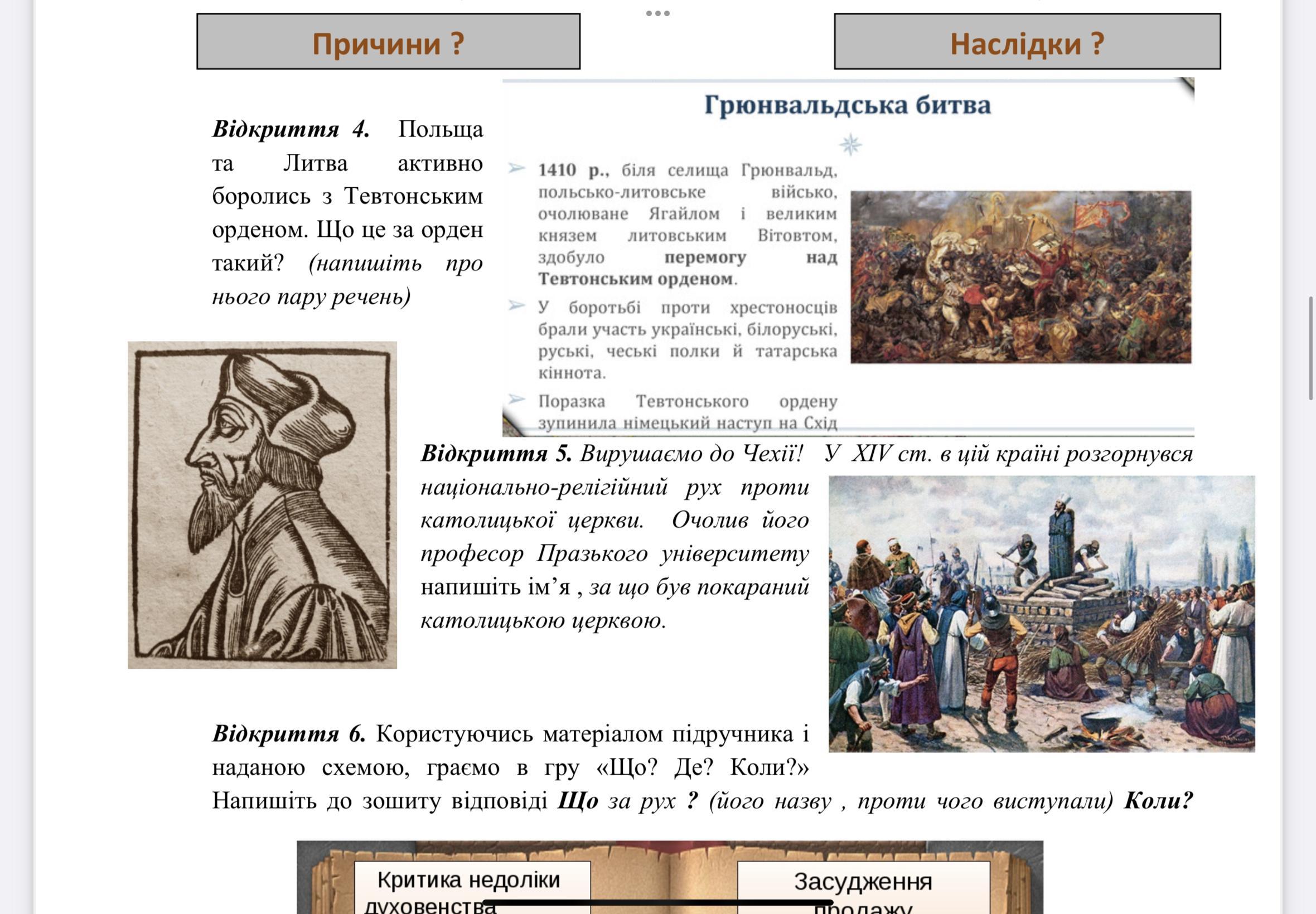 5.Професором Празького університету, який очолив національно-релігійний рух проти католицької церкви у XIV столітті, був Ян Гус. За свої ідеї про реформування церкви і зняття влади з рук папи Римського він був оголошений католицькою церквою еретиком і після суду на чеському сході був сожжений на вогнищі як єретик у 1415 році. Його смерть стала приводом для початку гуситської революції в Чехії.