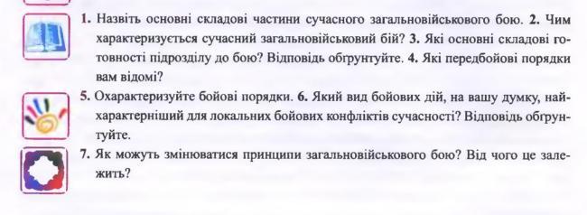 1.До основ загальновійськового бою відносяться: визначення бою; мета, з якою ведеться бій; завдання, з виконанням яких досягається мета бою; сили та засоби, що визначаються для виконання завдань у бою; бойовий порядок підрозділів для ведення бою; побудову оборони (наступу); побудову системи вогню; порядок управління та взаємодії; завдання бойового (всебічного) забезпечення бою; нормативні показники бою; роль і місце підрозділу в бою; зміст підготовки бою; характерні риси та принципи бою.