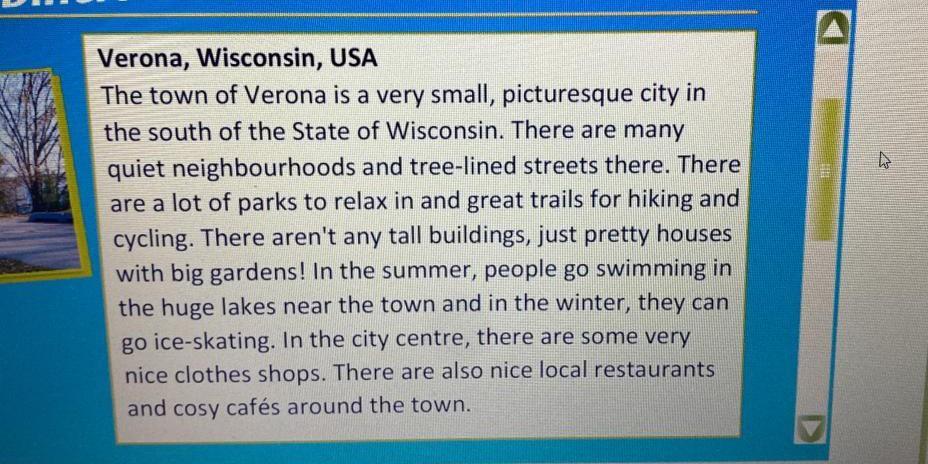 Verona is a very small town in the south of the State of Wisconsin. There are a lot of parks. There aren't any tall buildings, just small houses with gardens. In the summer people go swimming, in the winter - ice-skating. There are many clothes shops in the city center. There are also local restaraunts and cafes around the town.