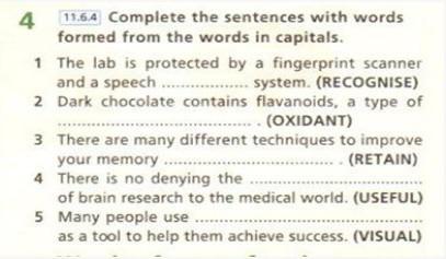 1 The lab is protected by a fingerprint scanner and a speech recognition system. (RECOGNISE) 2 Dark chocolate contains flavonoids, a type of antioxidants (OXIDANT) 3 There are many different techniques to improve your memory retention. (RETAIN) 4 There is no denying the usefulness of brain research to the medical world. (USEFUL) 5 Many people use visualisation as a tool to help them achieve success. (VISUAL)